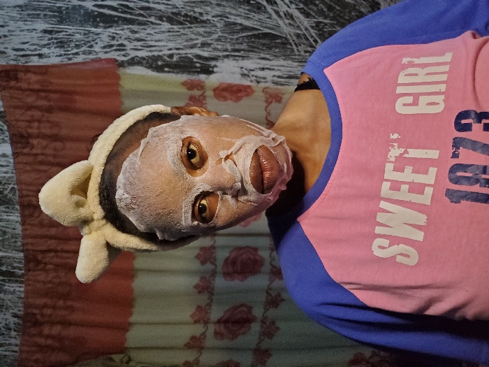 A person wearing a face mask and a headband is lying on a bed. They are wearing a pink shirt with blue sleeves that reads "Sweet Girl 1973". The person is looking directly at the camera. The bedsheets appear to be patterned. The lighting suggests it is indoors.