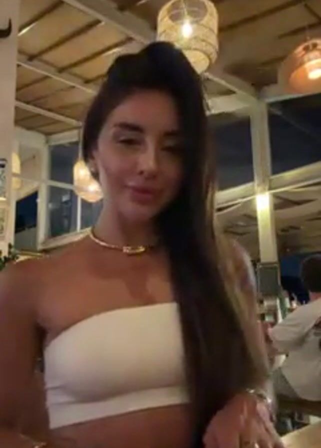A woman is indoors, at night, presumably at a restaurant. She is wearing a white strapless top and a gold choker. She has long, dark hair which she flicks with her fingers. She is wearing multiple bracelets and a watch. The restaurant has pendant lights, a woven lampshade and is surrounded by glass. There are other patrons visible in the background.