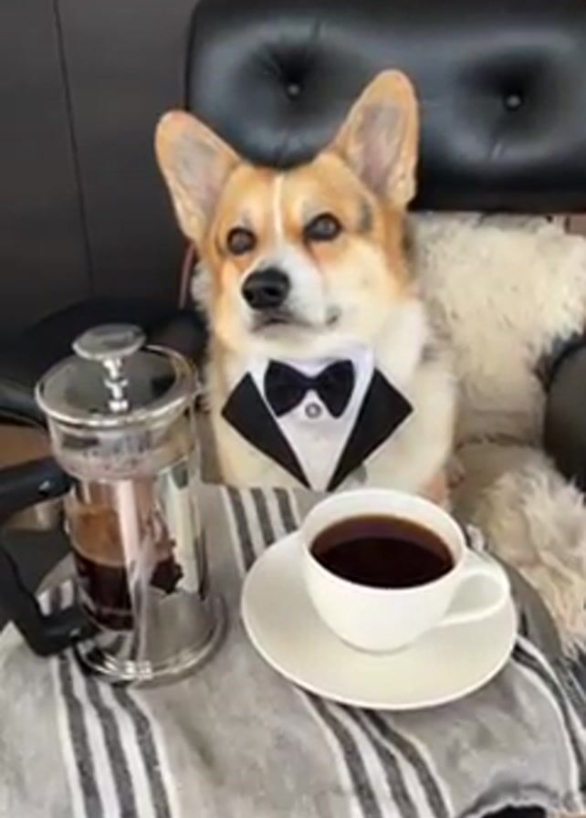 - "A corgi wearing a black tuxedo bib sits in a black leather chair next to a French press and a white teacup full of black coffee" by FM-4GKkh1, licensed under CC BY 4.0