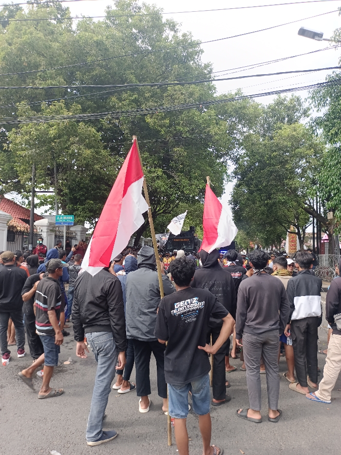 The image depicts a large gathering of individuals on a paved street in Kecamatan Pati, Indonesia, specifically on Jl