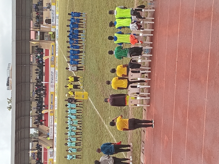 This image depicts an outdoor football stadium scene in Meru, Kenya, likely during a pre-match ceremony