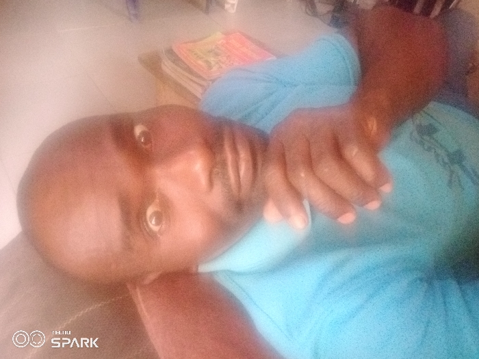A dark-skinned adult male with a bald head is depicted in a close-up, upward-facing shot