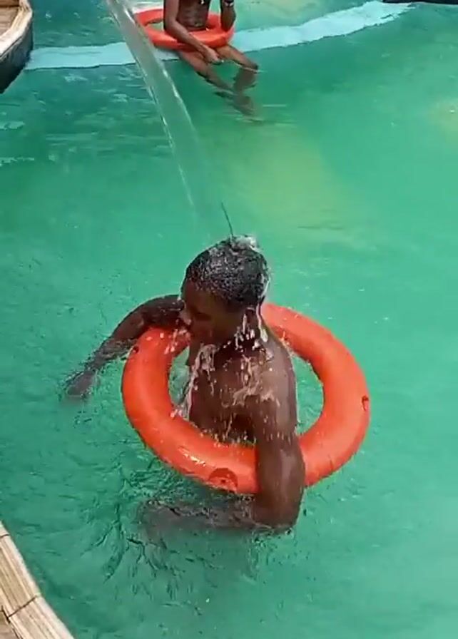 Two shirtless Black men are enjoying a pool. One man is sitting in an orange inflatable ring in the background, while the other man is standing in the foreground with his arms resting on his inflatable ring. A stream of water is being poured on his head. He briefly sticks his tongue out. The pool has a rectangular shape with a small section separated from the main pool by a thin lane.