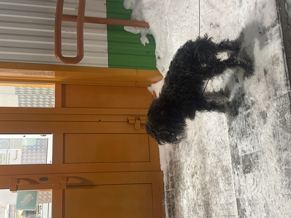 In Chaikovsky, Russia, a medium-sized, dark-furred dog, appearing to be of a shaggy or curly-haired breed, stands on a snow-covered paved surface