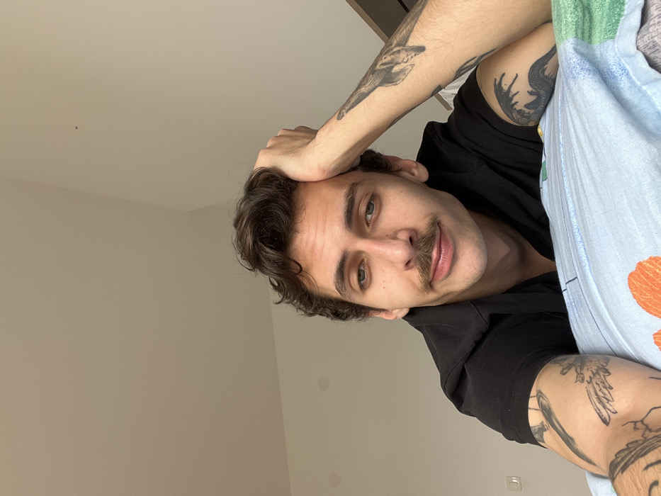 A male individual is depicted in a close-up, indoor setting, reportedly located in Bečići, Montenegro. The subject is a young adult male with dark, wavy hair, a mustache, and light-colored eyes. He is shown from the chest up, reclining, with his head propped by his right hand. He wears a black short-sleeved collared shirt. Tattoos are visible on both forearms and biceps, featuring designs that include a winged creature on the right forearm. His left forearm also rests on a pillow. He gazes directly forward with a subtle smirk or smile. The pillow beneath him is light blue with orange and green patterns. The background consists of plain, light-colored walls and a ceiling, with a wall corner visible in the upper left and a faint rectangular fixture on the lower left wall.