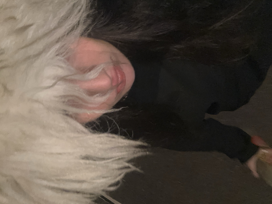 This scene is situated in the city of Strasbourg, France. An overhead perspective captures a single individual in a low-light, outdoor environment. The person's face is largely obscured by an abundance of light-colored, shaggy hair or a wig that covers the forehead and eyes, leaving only the lower nose and mouth visible. Dark hair is visible along the sides of the head. The individual wears a dark-colored top or jacket. The right hand, extending into the lower-left portion of the frame, holds a light-colored object, possibly a bottle, with a reddish label. The background consists of a dark, undifferentiated paved surface, characteristic of a street or sidewalk at night.