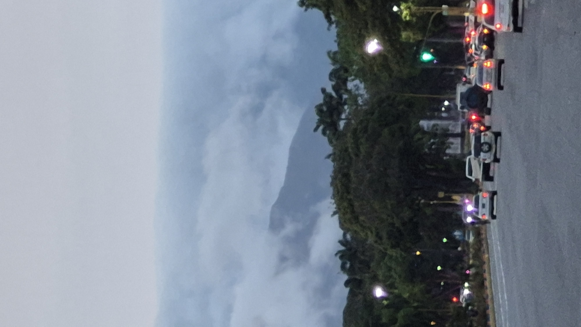 This image depicts a wide urban avenue in Valencia, Venezuela, consistent with Avenida Bolívar, with a mountain range visible in the distant background. The scene is observed under heavy overcast conditions, possibly at dusk or dawn, given the low ambient light and active artificial illumination. In the foreground, a multi-lane asphalt road extends from the viewer, featuring a distinct median strip with low curbing. Approximately ten to fifteen vehicles, predominantly sedans and SUVs of varying colors (including white and dark tones), are present on the road. Most vehicles exhibit illuminated headlights or taillights; several red brake lights are active, indicating either stopped or slow-moving traffic. The midground is characterized by dense, mature green foliage, including numerous trees and palm trees, lining both sides of the avenue beyond the median. Interspersed within the greenery are multiple street light fixtures, emitting bright, diffuse glows, some with a purple-white hue. A partial view of a water fountain feature is visible among the trees in the center-right. A traffic light on the right side of the road displays a green signal. The background reveals a large mountain range, heavily shrouded in dense, low-hanging clouds or mist, which blend into the light gray, overcast sky. The upper portions of the mountains are obscured by this atmospheric condition.