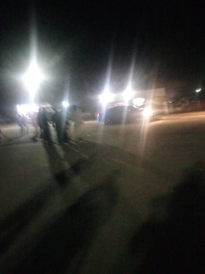 A nighttime scene shows a group of people, silhouetted against bright lights, seemingly gathered on a dark, paved surface. A car is visible in the background. Long, dark shadows stretch across the ground, cast by the individuals and possibly other unseen objects. The lighting creates a stark contrast, obscuring details and focusing the view on shapes and silhouettes. The overall impression is blurry and dark.