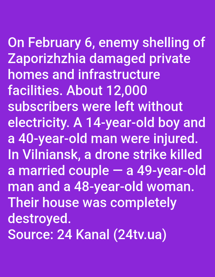 On February 6th, enemy shelling in Zaporizhzhia damaged private homes and infrastructure, leaving approximately 12,000 subscribers without electricity. A 14-year-old boy and a 40-year-old man sustained injuries. In Vilniansk, a drone strike resulted in the deaths of a married couple, a 49-year-old man and a 48-year-old woman, destroying their home. The source of this information is 24 Kanal (24tv.ua).