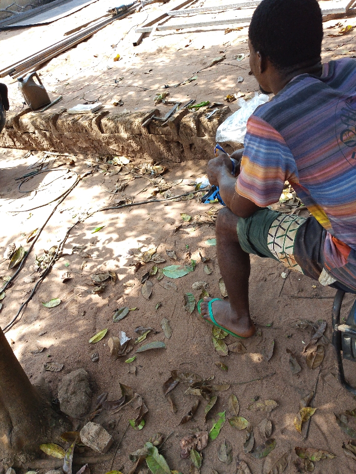 The scene, identified as Alor, Nigeria, depicts an outdoor, unpaved area. An adult male is seated with his back partially to the camera, wearing a multi-colored striped short-sleeved shirt, dark green patterned shorts, and a single green flip-flop on his right foot. His hands are occupied with a small object held over a clear plastic bag. The ground is reddish-brown earth, strewn with dried and green leaves. Black electrical cables are visible across the ground. A raised earthen ledge runs horizontally in the mid-ground, upon which various small, dark rectangular objects are arranged. To the left of the ledge, a brown plastic jerrycan rests on the ground. In the background, long metal bars and a power tool are visible. A tree trunk and several rocks are present in the lower-left foreground. The area is partially shaded by overhead foliage, casting distinct shadows.