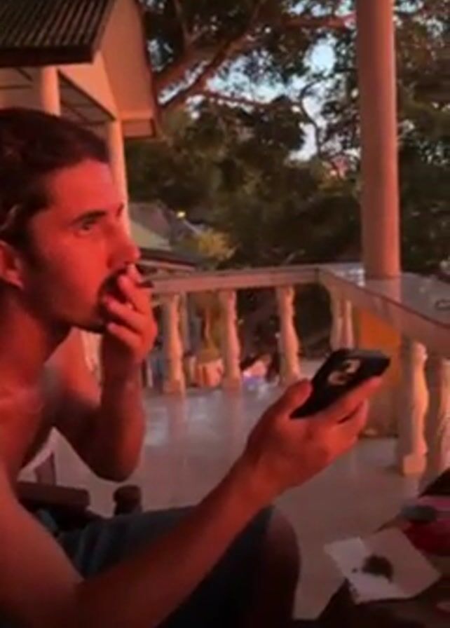 man sitting on a porch, smoking and looking at his phone. He is shirtless and wearing shorts. The porch has white railing and pillars. The video pans from the man to a view of the ocean. There are trees and mountains in the distance, and the sky is a mix of pink, purple, and orange.