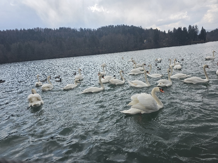 An overhead, slightly angled shot captures a wide expanse of dark, rippled water, likely Zbilje Lake in Medvode, Slovenia, under an overcast sky. Approximately 25-30 white mute swans are scattered across the water surface, predominantly in the midground and foreground, actively swimming or floating. Several ducks, darker in plumage, are also visible interspersed among the swans, primarily in the mid-distance. A prominent swan in the foreground, right of center, faces left, displaying its white feathers and a distinctive red-orange bill. The background consists of a dense, dark forest covering a hillside, extending across the horizon. The trees appear to be a mixture of bare deciduous trees, indicating a colder season, and darker evergreen conifers. The sky is a uniform light grey, characterized by thick cloud cover.
