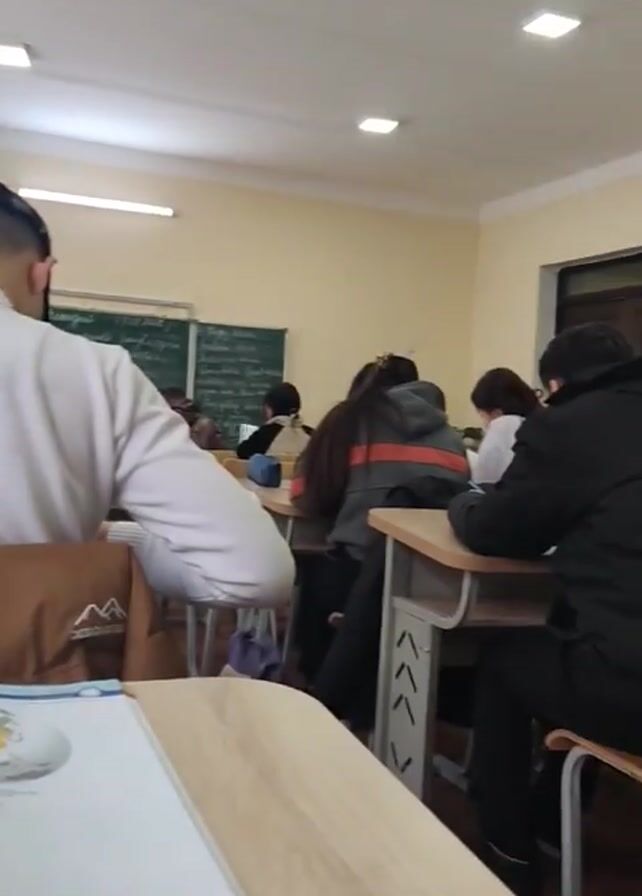 classroom environment with students seated at desks, presumably during a lecture or study session