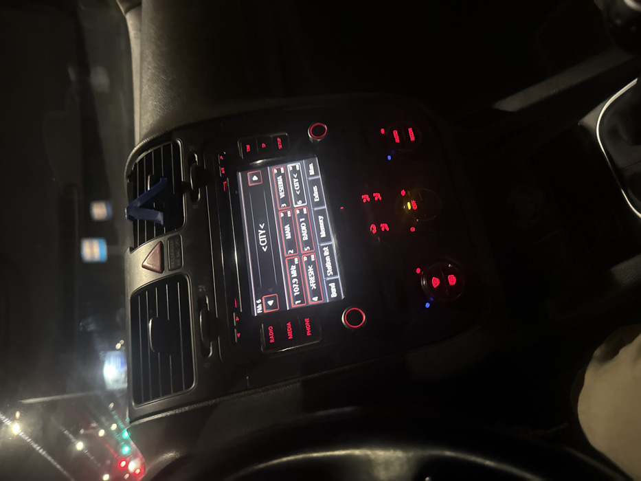 The image displays the interior of a vehicle at night, specifically the dashboard and central console from a driver's perspective