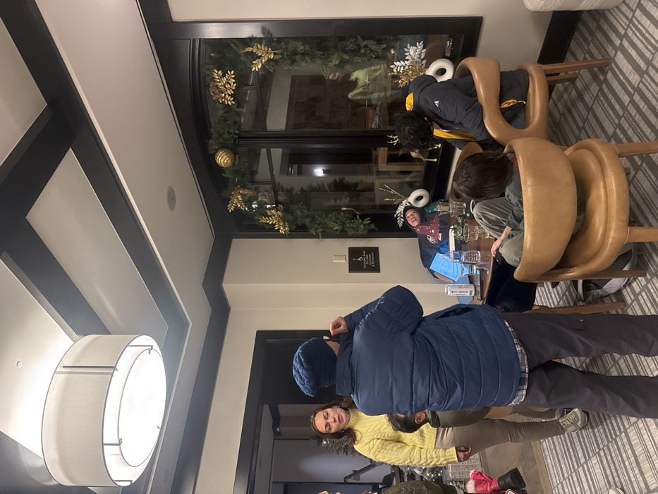 A brightly lit room with a coffered ceiling. A large, round light fixture illuminates the scene. Below, a group of people stands, including a woman in a yellow sweater and a person in a blue jacket and beanie. In the background, a window decorated with greenery and ornaments is partially visible, reflecting the people inside. Seated at a table are additional individuals, possibly children, in high-backed, modern chairs. A sign is posted on the wall next to the window.