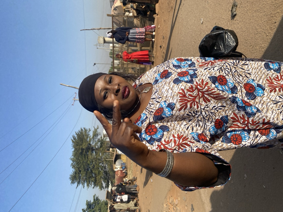 The image depicts an outdoor scene in the city of Nassarawa, Nigeria, under a clear blue sky. In the foreground, a woman with dark skin stands centrally, facing slightly right and looking towards the camera. She wears a black headscarf, a light-colored dress with a vibrant blue and red floral and leaf pattern, and multiple silver-toned bangles on her left wrist. A silver-toned pendant hangs around her neck. Her left hand is raised to chest level, with the index finger and thumb extended, forming a pistol-like gesture, while the other fingers are curled. Her lips are a dark red color. A black plastic bag hangs from her right arm. In the middle ground, to the left of the main subject, several individuals are visible near makeshift structures, including a red cylindrical object resembling a fuel tank. Further back, on the right side of the frame, two women are standing. One woman is dressed in a red gown, and the other wears a dark top with a patterned skirt and a white head covering. They appear to be near market stalls or simple structures made of wood and corrugated metal. The ground surface is unpaved, appearing as dirt or gravel. In the background, power lines traverse the sky, supported by wooden poles. A tall concrete water tower is visible on the far right horizon, alongside distant trees. The lighting suggests daylight, with shadows indicating the sun is overhead or slightly to the side.