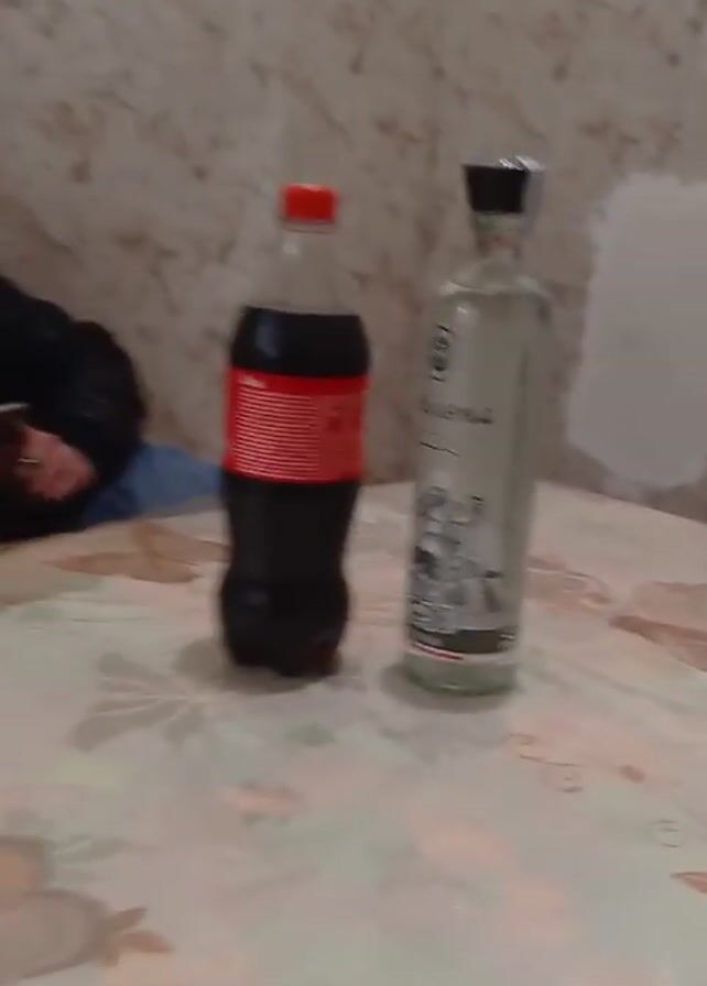 The video pans across a table with a bottle of clear liquid, a bottle of Coca-Cola, and a green basket. A man wearing a cap and a dark jacket appears briefly, looking at his phone. The video then focuses on the doorway of a room. The room contains more of the same wallpaper and a tiled floor.