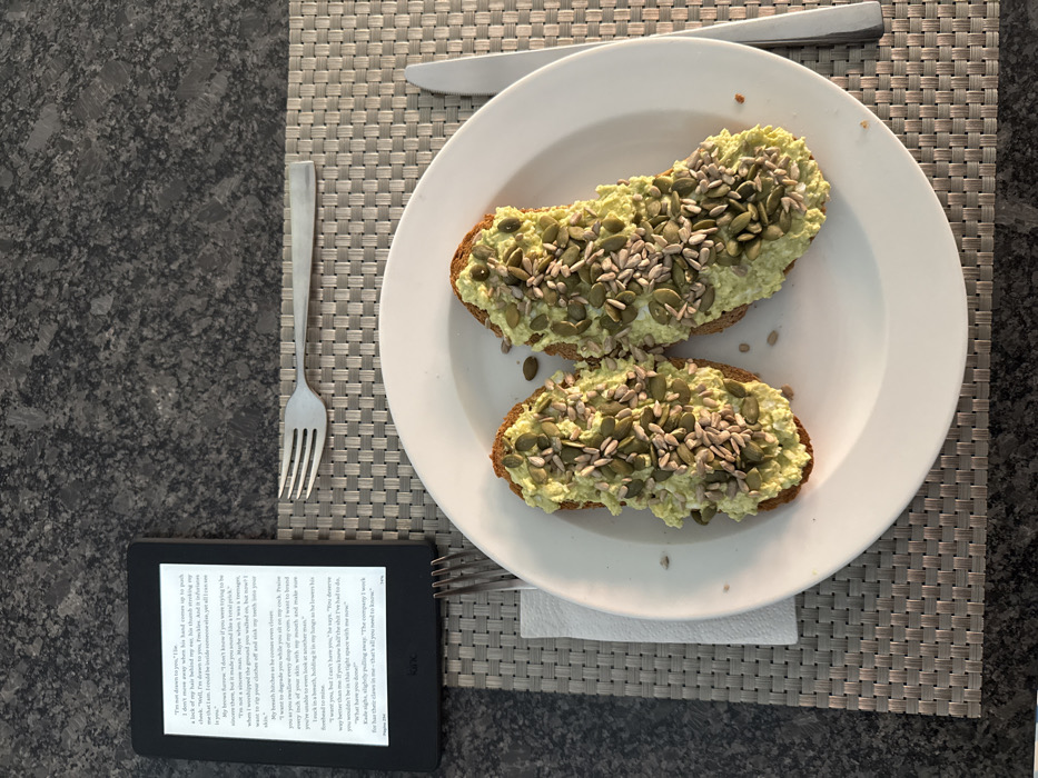 An overhead view depicts a prepared meal and an e-reader on a dark grey, mottled countertop. A light grey, woven placemat is centered on the counter. On the left side of the placemat, a black e-reader, identifiable by the Kindle logo, displays white text on a black screen. A silver metal fork lies horizontally on the placemat above the e-reader. A white, round plate occupies the lower half of the placemat, holding two pieces of avocado toast. Each toast slice is topped with a light green spread, heavily garnished with pumpkin and sunflower seeds. A silver metal knife rests vertically to the right of the plate. A second silver metal fork is partially visible on a small white napkin to the left of the plate. The scene is illuminated by strong directional light from the left. The location is an indoor setting within Unknown, Unknown.