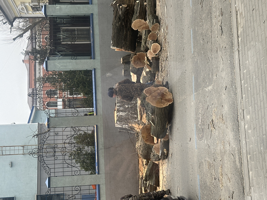 The image depicts a street scene in Rostov-on-Don, Russia, specifically in front of the Don State Public Library. In the midground, a substantial quantity of recently felled tree logs and segments, varying in diameter from approximately 0.3 meters to 1 meter, are scattered across an asphalt road surface. Wood chips and sawdust are evident on the road and surrounding dirt. A large, light-barked tree stump, approximately 1.5 meters in diameter, is visible near the center-left. Two individuals, dressed in camouflage-patterned work clothing, are observed standing among the logs near the stump, facing away from the viewer. A third individual, wearing a high-visibility yellow garment, is partially visible behind a fence on the left. The street features a visible manhole cover and faint blue markings. The foreground shows a grey brick sidewalk. In the background, a low grey wall topped with an ornate black wrought iron fence featuring decorative scrollwork, including an open book motif, delineates property boundaries. Behind this fence, on the left, stands a light blue building with a grey base and an attached exterior ladder. To the right, the main facade of the Don State Public Library is visible, characterized by its reddish-brown color, arched windows, and classical architectural details. Evergreen trees and bare deciduous branches are also present behind the fence. The sky is overcast.
