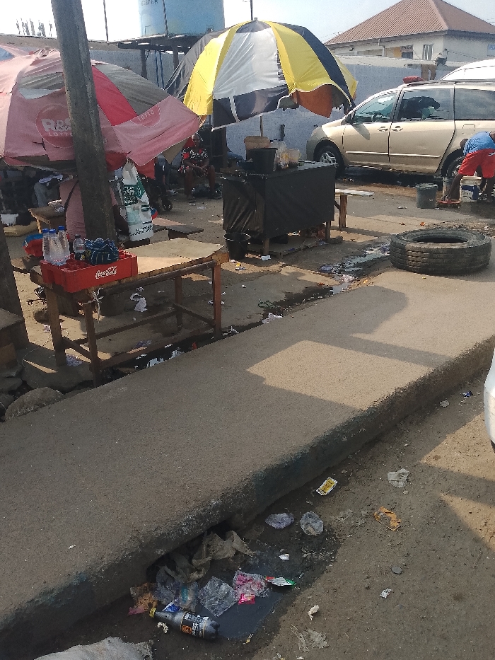 This image displays an informal commercial street scene in Port-Harcourt, Nigeria, under bright daylight