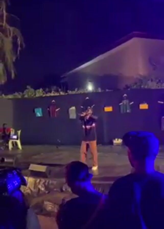 A man wearing a dark jacket, brown pants, and white shoes is rapping on a stage at night. He holds a microphone and moves while rapping. Several people are watching him, taking pictures with their phones. The stage is decorated with shrubs and lights. Behind the stage is a black wall with several shirts hanging on it. A building with a slanted roof is visible behind the wall. The atmosphere is dark, illuminated by stage lights.