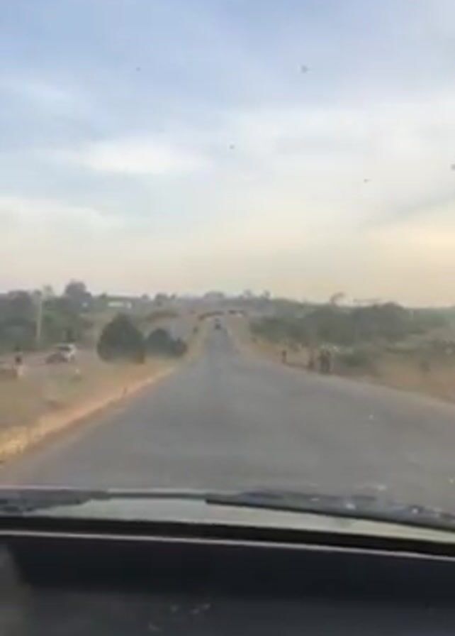 view from inside a moving vehicle, driving on a straight, paved road through a rural area. The road has yellow lines on each side. There are scattered trees and vegetation along the sides of the road, and a few buildings in the distance. Several people are walking along the road, some of whom appear to be standing on the side of the road. Utility poles are visible along the road. The sky is partly cloudy with a pale blue color. The dashboard of the vehicle is visible in the foreground, with a few droplets on the windshield.
