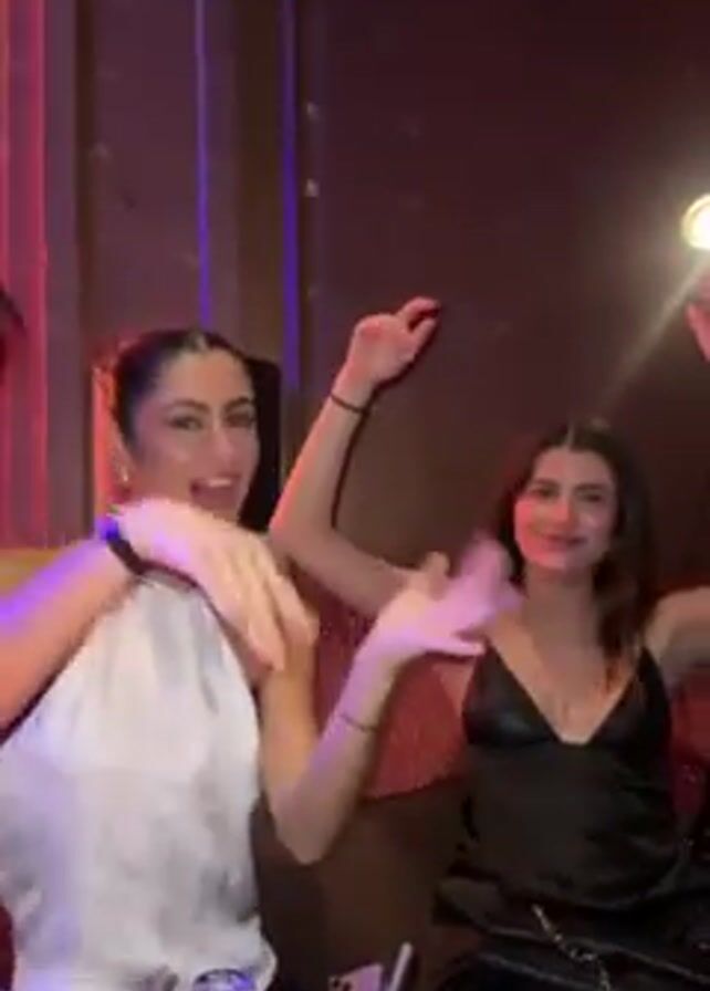 Two women, one wearing a white halter top and the other a black dress, dance together, raising their arms in the air. The women are sitting in a booth with drinks and straws on the table in front of them. The setting is dimly lit with burgundy and pink lighting. A third person is partially visible on the right side of the frame.