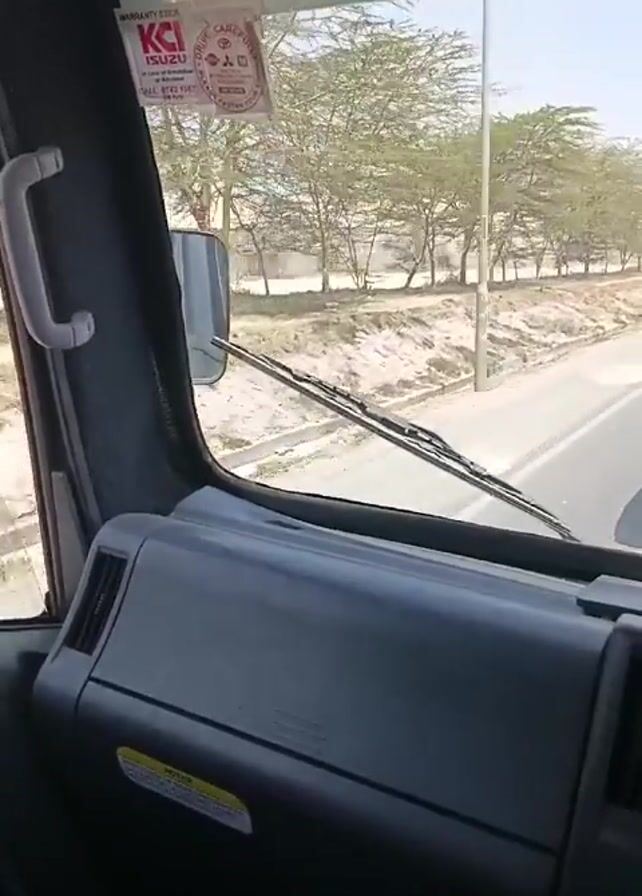 The view from inside a truck shows a paved road next to a sandy area with trees
