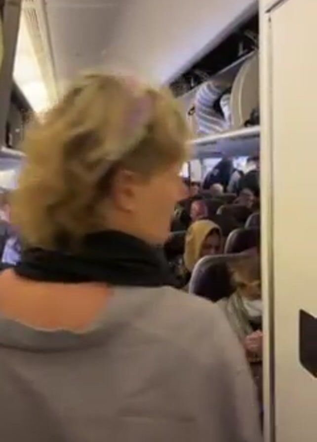 interior of a crowded airplane cabin. People are milling around in the aisle. Overhead storage bins are open, with bags and other items visible inside. Signs in both English and Arabic can be seen on a panel next to the lavatory door. A woman with curly hair and a gray shirt is facing toward the front of the plane.