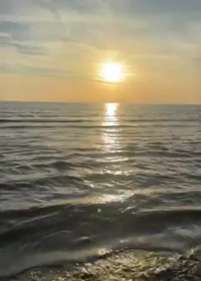 sunset over the ocean. The sun is a bright yellow-orange disc, low on the horizon. It reflects in the water, creating a shimmering path of light. The sky is a pale blue with some wispy clouds. Gentle waves lap at the sandy shore. No people or other objects are visible.