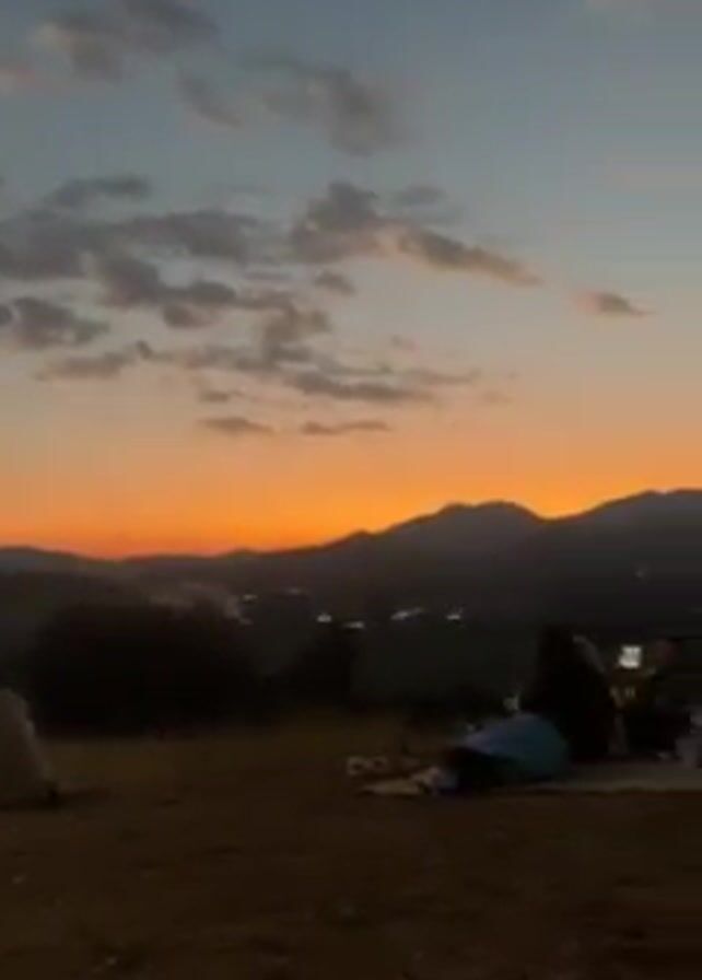 group of people gathered on a hilltop at sunset. Silhouettes of the group are visible against the horizon, some sitting on blankets or mats. The sunset paints the sky in hues of orange and red, with clouds scattered across the sky. In the distance, there are mountains and a valley with lights suggesting a town or city. The foreground is a dirt or grassy area.
