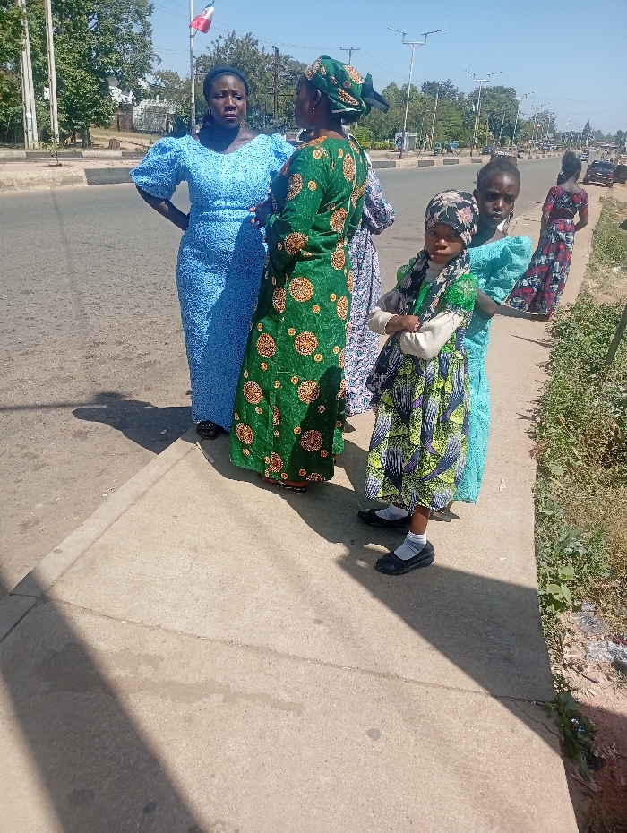 The image displays a sunlit outdoor scene in Jos, Nigeria, featuring six individuals on a concrete sidewalk adjacent to a paved road. In the left-center, an adult female in a light blue lace dress and dark head covering stands, facing right, seemingly in conversation with another adult female to her right, who wears a green patterned dress and headwrap, facing left. A third adult female, also in a patterned dress, is partially visible behind the green-dressed woman. In the immediate foreground, a young girl, estimated to be 5-7 years old, wears a multi-colored patterned dress over a light long-sleeved top, a patterned headscarf, black shoes, and white socks; she stands with arms crossed, looking directly forward. To her right, an older girl, approximately 8-10 years old, in a light blue patterned dress, stands looking slightly right. Further down the road on the right, a sixth individual, seen from behind in a dark patterned dress, is positioned on the sidewalk. The background features a multi-lane asphalt road with distant vehicles, roadside trees, and streetlights. A flagpole with a green, white, and green flag is visible on the left side of the road. The sky is clear blue, and distinct shadows are cast by the individuals and surrounding objects due to strong sunlight.