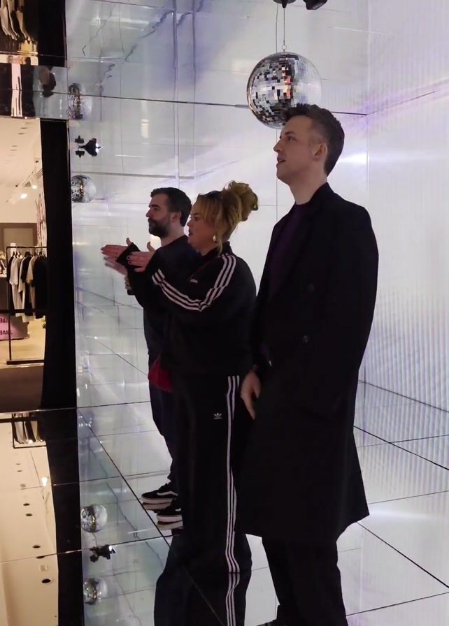 Three people stand in what appears to be a mirrored room. The reflections in the mirrors create a disorienting effect. The room features disco balls hanging from the ceiling. The first person from the left is a man with a beard wearing a dark t-shirt. Next to him is a woman wearing an Adidas tracksuit. She has her hair up in a bun. The third person is a man wearing a purple shirt and a black coat. All three have their arms outstretched in the same manner, seemingly engaging with the mirrored environment. There is also a shop visible beyond the mirrored area.