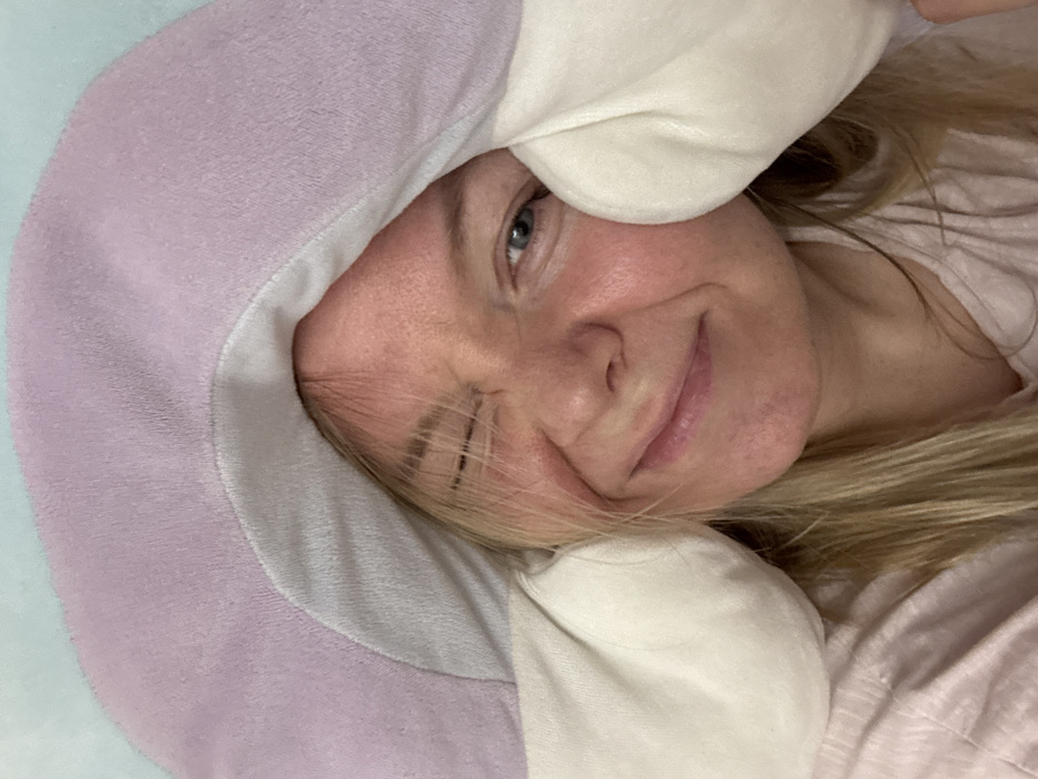 A close-up image depicts an adult individual with fair skin and blonde hair, partially obscured by a large, plush, crescent-shaped object