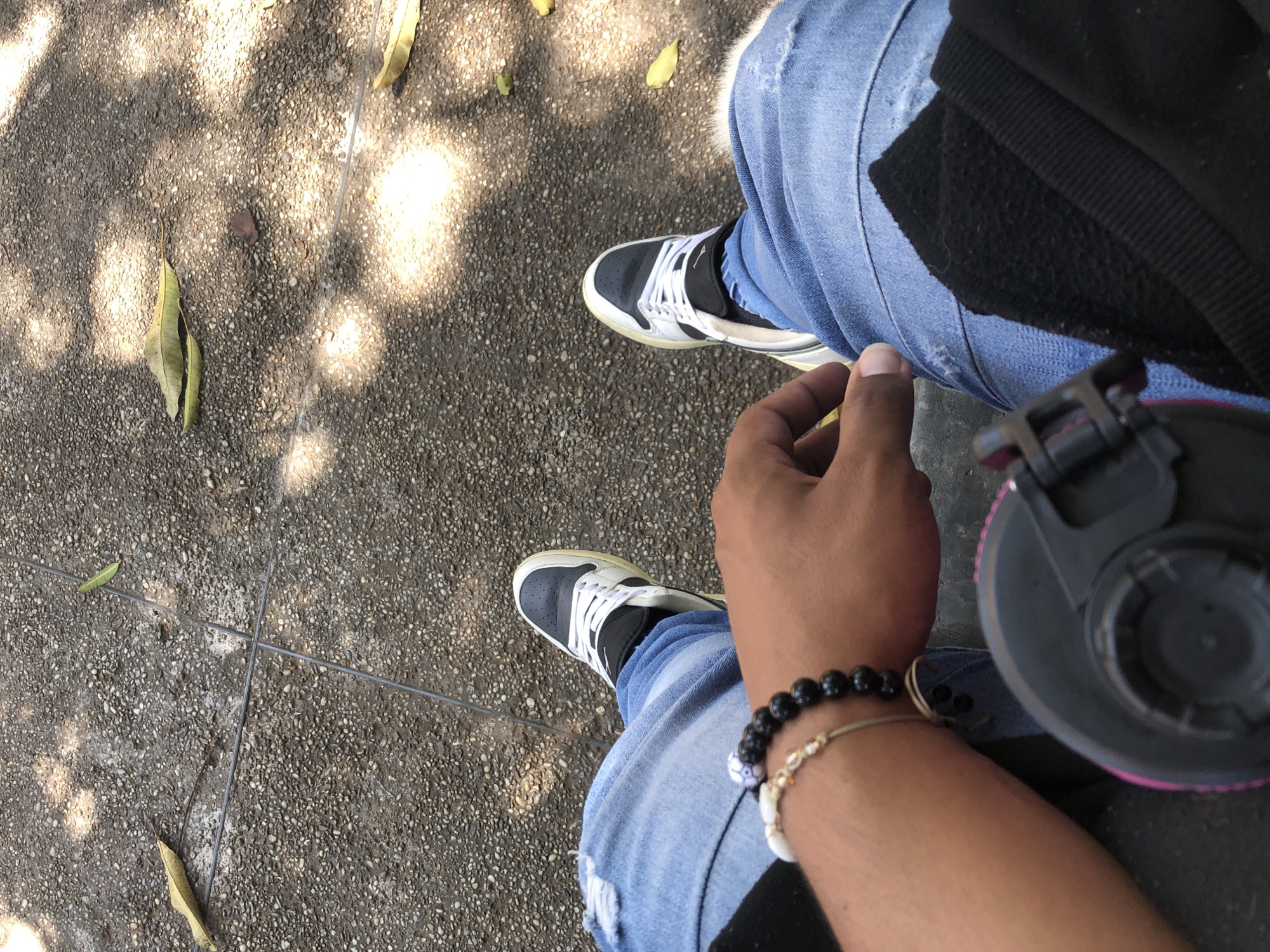 A person is sitting on a concrete surface in El Valle del Espíritu Santo, Venezuela. The person is wearing ripped blue jeans and black and white sneakers. A black beaded bracelet and a gold bracelet are on the person's right wrist. Headphones are visible on the person's right. Leaves are scattered on the concrete surface.