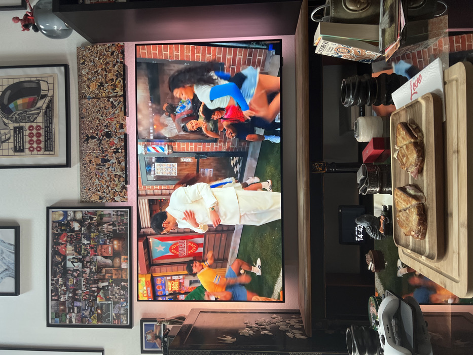 The scene is an interior view within a residential setting in Plaisir, France. In the foreground, a dark, reflective table holds a light wooden cutting board presenting two diagonally sliced, grilled sandwiches with visible melted cheese and ham, placed on a wooden rectangular tray. Adjacent to the tray is a folded white napkin with partial red text. To the left of the tray, a white Xbox controller is positioned. Other items on the table include a dark soccer boot figurine, a digital clock displaying "14:42", an ornate dark lidded container, a red rectangular box, a white cylindrical object, a stack of black rings, and a book titled "Dostojewski". The midground features a large flat-screen television displaying a vibrant music video. The video depicts a man in a white suit and sunglasses, standing centrally with his hand on his chest. To his left, a man in a yellow shirt and blue shorts appears to be running on artificial turf. To his right, several women are dancing outside a brick building featuring a barber pole, including one in a light blue top and denim shorts. A Puerto Rican flag with the word "CONEJO" is visible on the building facade. The television emits a pinkish ambient light from its edges. Below the TV is a dark wooden console table with golden embellishments. The background consists of a white wall adorned with framed artworks, including a large photo collage, a three-panel artwork depicting a crowd, and a framed print of a robotic helmet with accompanying text. To the far left, an ornate dark wooden cabinet displays a small statue and another framed picture. To the far right, a portion of a dark bookshelf is visible, topped with a spherical object and a red Spider-Man figurine.