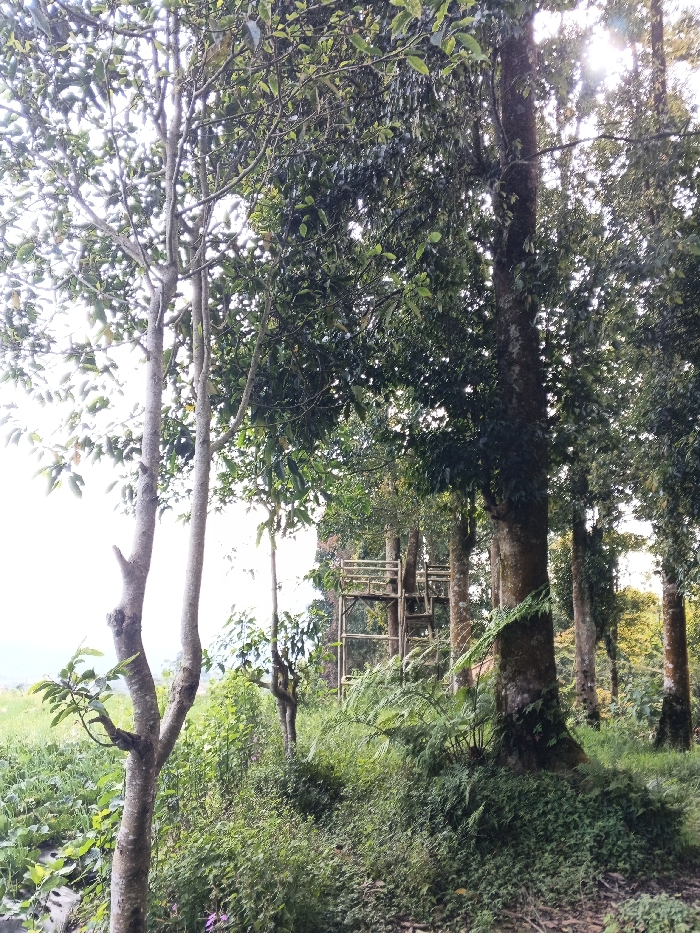 A lush forest scene showcases diverse greenery. Tall trees dominate, some with dense leaves and others with thinner foliage. A wooden structure, possibly a treehouse or platform, stands amidst the trees. Ground vegetation includes ferns and various plants, creating a vibrant and layered landscape. Sunlight filters through the trees, adding depth and highlighting textures. A cultivated field extends beyond the forest's edge on the left.