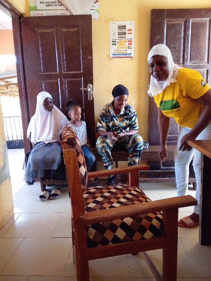 The image depicts an indoor scene, likely a waiting area or office, in Dungu, Ghana. The floor is covered with light-colored tiles. In the immediate foreground, an empty wooden armchair is positioned with its back and right armrest facing the viewer. The chair features a seat and backrest upholstered in a geometric pattern of brown, black, and cream diamonds. In the midground, from left to right, three individuals are seated on a dark wooden bench against a light yellow wall. A young female, dressed in a white hijab and a grey skirt over dark trousers, sits with white slippers near her feet. Adjacent to her is a young girl with dark hair, wearing a light-colored patterned top and blue jeans. Next to the girl is an adult female wearing a dark headscarf and a camouflage-patterned long-sleeved top and matching trousers; she is looking down at her hands, which appear to be holding a small object. To the far right, an adult female stands, leaning slightly forward and smiling towards the viewer. She wears a white head covering, a bright yellow t-shirt with green and dark horizontal stripes and text below, light-colored trousers, and red slippers. Her right hand rests near a dark wooden table or counter, partially visible on the right edge of the frame. In the background, a dark brown wooden double door with a silver-colored handle is closed. Above the door, a white poster is partially visible, displaying text related to health, including "Visit your health... register for free" and logos for USAID and UNICEF. To the right of the door, another poster containing various charts and text is affixed to the yellow wall.