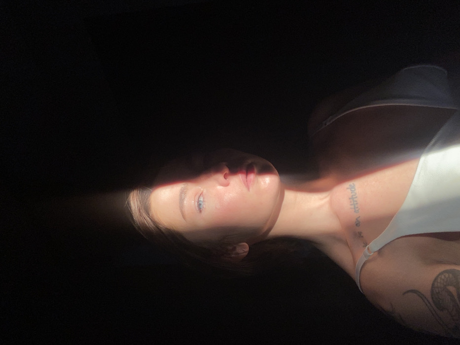 A female individual with light skin, blue eyes, and brown hair is depicted in a close-up, high-contrast portrait. She is wearing a light-colored, thin-strapped garment. A tattoo reading "an attitude" is visible on her upper left chest, and a portion of a serpent or dragon tattoo is visible on her left upper arm. A narrow, vertical shaft of bright light, consistent with natural sunlight, illuminates the right side of her face (viewer's left), including her right eye, nose, mouth, neck, and upper chest. The remainder of her body and the background are enveloped in deep shadow, rendering all other environmental details indistinct and black. The subject maintains a neutral expression, gazing towards the viewer. The immediate environment is an interior space with a concentrated light source; no specific architectural features or objects are discernible. The image provides no visual information to ascertain a specific location within the city of Ust-Ilimsk, Russia.