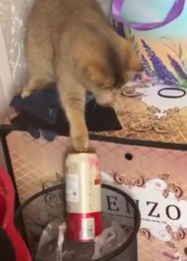A brown and tan cat is standing on a surface next to a black mesh trash can. The can contains a few plastic bags and a can. The cat puts its paw on the can and then pushes it into the trash can. After the can falls, the cat moves away from the edge of the surface. The surface has clothing on it and a box decorated with patterns and the word "KENZO." Behind the box is a tote bag with a lavender design. A red trash bin is partially visible on the left side of the frame. The background includes patterned wallpaper.