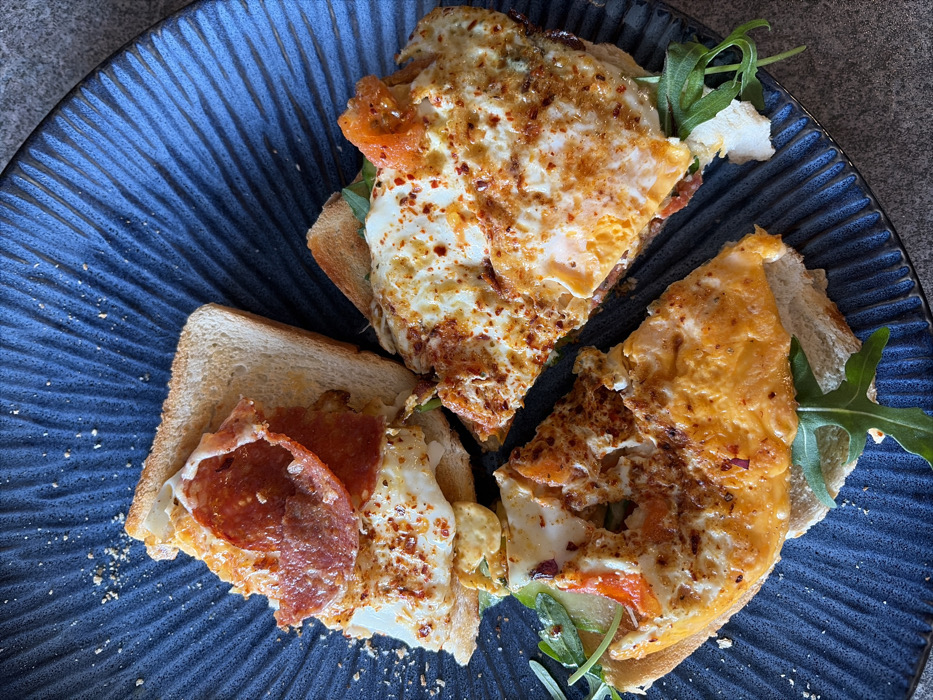 An overhead close-up view displays a meal served on a dark blue, radially ribbed ceramic plate. Three irregular pieces of toasted bread, each topped with pan-fried eggs, are centrally arranged on the plate. The eggs are speckled with red chili flakes. The top-left toast piece features multiple slices of pepperoni atop its egg. The bottom toast piece includes what appears to be melted cheese and red bell pepper pieces with the egg, resting on a bed of green arugula leaves. The middle-right toast piece also has red bell pepper visible on its egg. The plate rests on a light grey, untextured surface. No individuals, hands, or utensils are visible in the scene. The depicted location is the city of New Forest, United Kingdom.