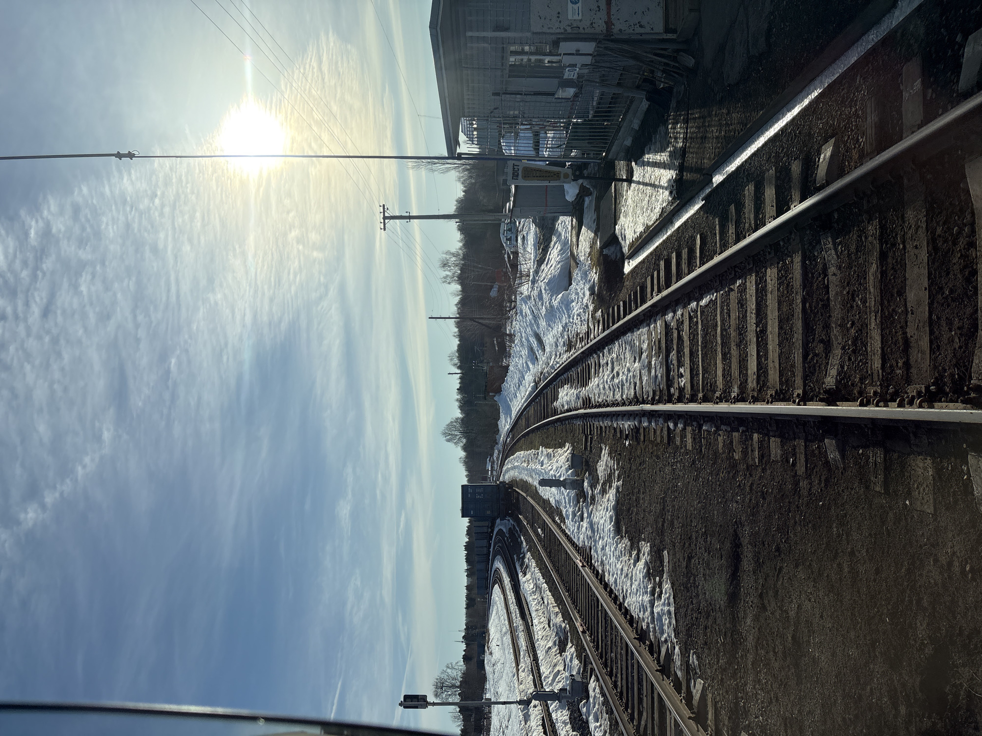 The image depicts a railway junction in the city of Кварса, Russia, under bright daylight with a clear blue sky and scattered cirrus clouds. The scene is observed from a slightly elevated perspective, possibly from a train or vehicle. In the foreground and mid-ground, multiple parallel railway tracks, comprised of metal rails on wooden sleepers, diverge and curve. The tracks on the left curve sharply to the left, while those on the right curve to the right. The ground between and adjacent to the tracks consists of dark gravelly soil interspersed with patches of melting snow. On the far left, a tall, dark grey railway signal post with a vertical rectangular signal head is visible. Further along the tracks on the left, a line of dark freight cars, including what appears to be a dark blue or black container car, is stationary. To the right of the tracks, a light-colored, single-story building with a grey flat roof and a fenced enclosure is present. A yellow-and-black sign on a pole in front of this building displays the Cyrillic word "ПОСТ" (POST). Adjacent to this building are utility poles with overhead electrical or communication lines. A tall, slender metallic pole or antenna stands vertically in the mid-ground on the right, partially obscuring the bright sun. The background features bare deciduous trees and some evergreens, suggesting a late winter or early spring environment. No individuals are present in the visible frame. The bright sun, positioned in the upper right, casts distinct shadows across the scene.