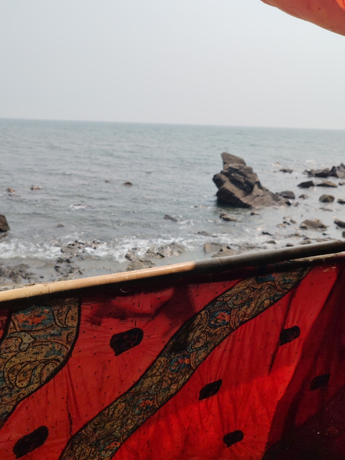 The image depicts a coastal scene in Querim, India, viewed from behind a patterned fabric barrier