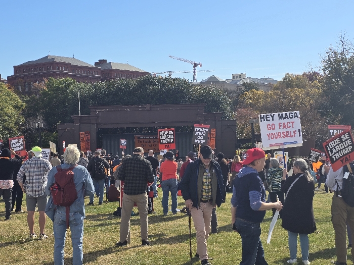 An outdoor political gathering is depicted at Freedom Plaza in Washington, D.C., under a clear blue sky. A crowd of individuals, predominantly adults, are dispersed across a grassy area, facing generally towards a brown stage structure in the mid-ground. The historic Old Post Office Pavilion, a large red-brick building, is visible in the background, with other distant buildings and a construction crane beyond. Attendees hold various protest signs; prominent examples include "HEY MAGA GO FACT YOURSELF!", "TRUMP MUST GO NOW!", and "¡QUE SE LARGUE TRUMP YA!" (Spanish for "TRUMP MUST LEAVE NOW!"). The environment includes scattered deciduous trees with green and autumnal foliage. People are observed standing and walking, holding their signs.