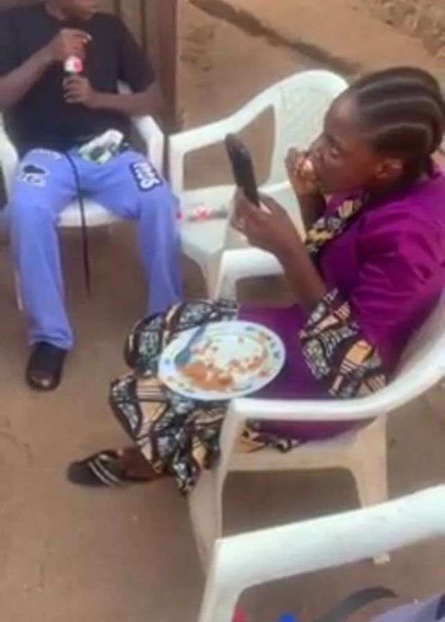 Here's a detailed description of the video: The scene takes place outdoors in a sandy area, possibly a courtyard or backyard. A young man wearing a black t-shirt, blue sweatpants with white graphics, a blue beanie, and sandals sits in a white plastic chair. He is holding a small item, possibly a lighter or small bottle. Next to him sits a woman wearing a magenta top and a patterned skirt. She is holding a smartphone in her left hand and looking at it while eating from a plate on her lap. The plate appears to contain rice and some kind of sauce or topping. Several other white plastic chairs are nearby. There is a bottle of water and what appears to be a container of sauce or condiment sitting on the ground by her chair. In the background, someone in a green shirt walks away from the scene. A wooden fence and part of a building or wall can be seen in the background as well.