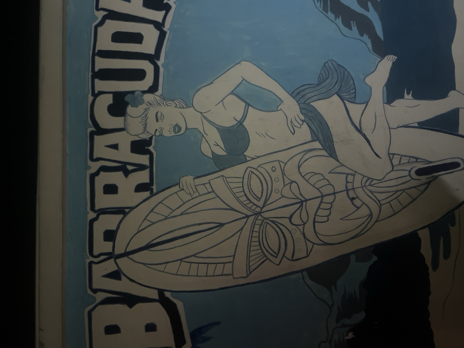 A light blue artwork features a pin-up style woman in a bikini, reclining on a surfboard with a carved tiki design. Vertical text reading "Barracuda" with a thick, bold font is along the edge of the image. There are abstract shadows and dark blue colors that may resemble rocks or water. The woman is mostly in shades of blue.