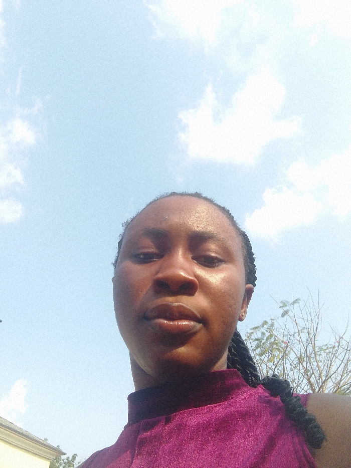 A woman is centered, facing forward. Her hair is braided. She wears a purple top. The background consists of a bright blue sky with scattered white clouds. The lighting suggests it is daytime and sunny. Some trees are visible to the right of the woman. A building is faintly visible on the lower-left side. The photo is taken from a low angle, looking up at the woman.