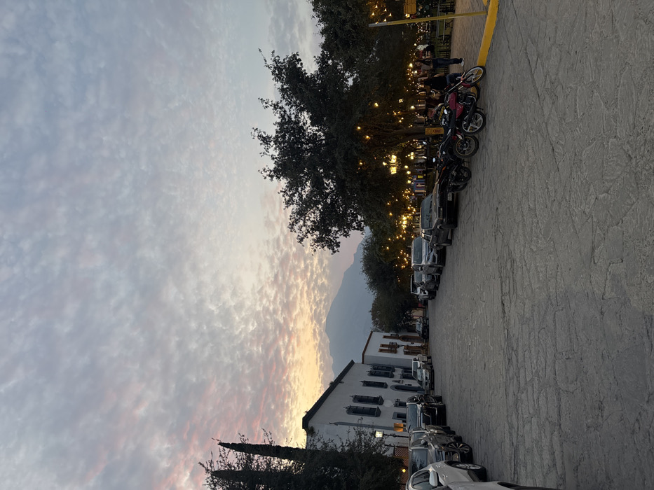 A streetscape with parked cars and motorcycles lines the right side of the image. The left reveals a cloudy sky with hints of orange, likely from a sunset. A building with white walls and multiple windows stands along the street. In the background, a mountain range is visible. Trees with string lights adorn the area, adding a warm glow. People can be seen walking near the lights, suggesting a public gathering space. The ground is paved with stone.