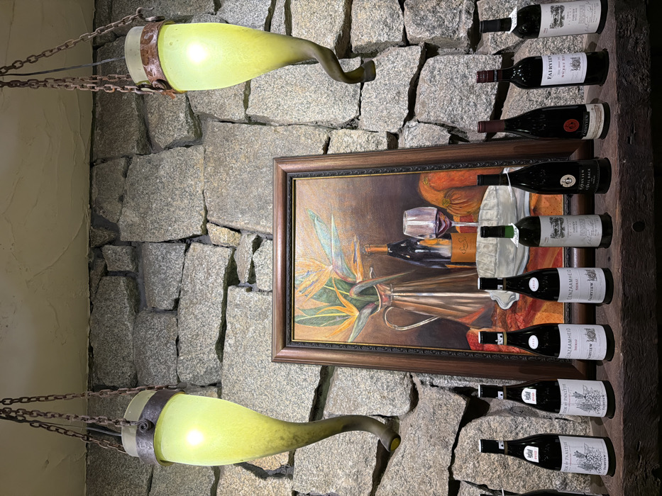 The image depicts an indoor scene within a wine-related establishment, specifically identified as being in Drakenstein Nu, South Africa. The primary background feature is a wall constructed from irregularly shaped, unmortared grey stone blocks. Suspended from the ceiling, on either side of a central artwork, are two illuminated pendant lights. These lights feature elongated, horn-shaped or twisted yellowish-green glass shades attached by dark metal bands and suspended by chains, emitting a soft, warm light. Centered on the stone wall is a large, framed still-life painting. The painting is enclosed in a dark brown, possibly wooden, frame. The artwork itself portrays a metallic pitcher filled with orange and blue "Bird of Paradise" flowers, a dark wine bottle, a clear glass containing red wine, an orange pumpkin or squash, and a draped white cloth, all set against a dark background. Below the painting, a thick, dark-stained rustic wooden shelf extends across the width of the frame. Arranged on this shelf are nine dark-glass wine bottles. Several bottle labels are legible, prominently displaying "FAIRVIEW," a winery known to be in the Drakenstein Municipality. Specific labels include "FAIRVIEW ENZAAMHEID SHIRAZ," "FAIRVIEW CYRIL BACK," and "BOER & PAALTJIE." The bottles vary slightly in height and label design, suggesting a collection of different vintages or varietals from the same producer. No individuals are present in the scene.
