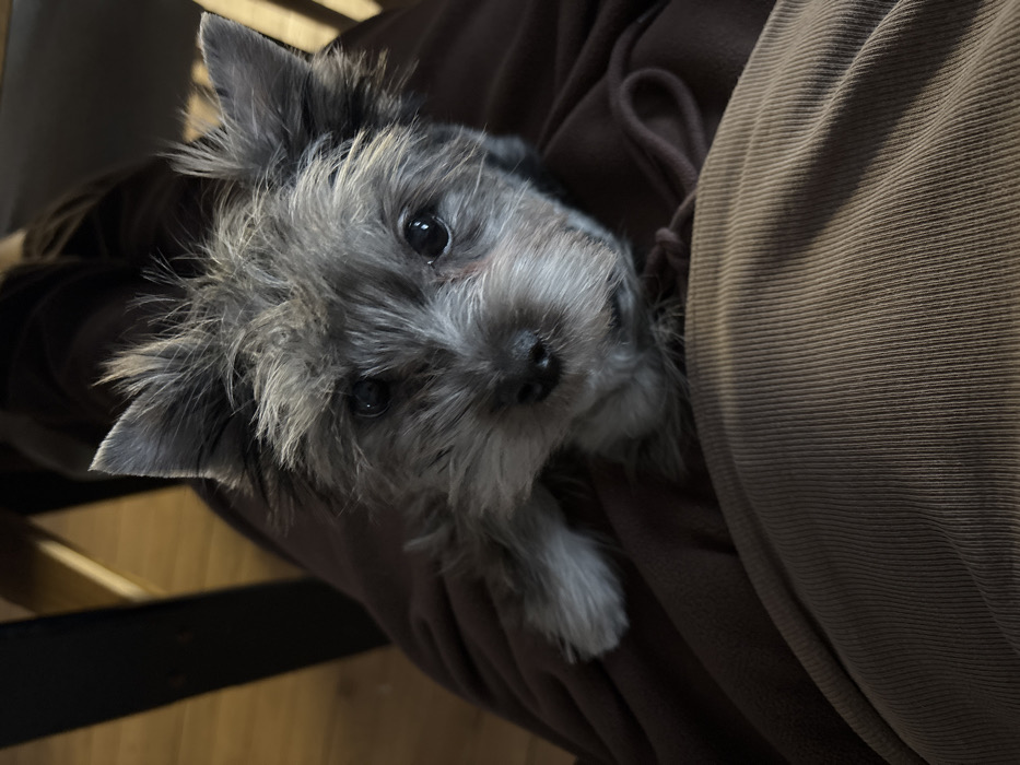 A small, gray and black shaggy-haired domestic canine, possibly a terrier type, is positioned on a person's lap